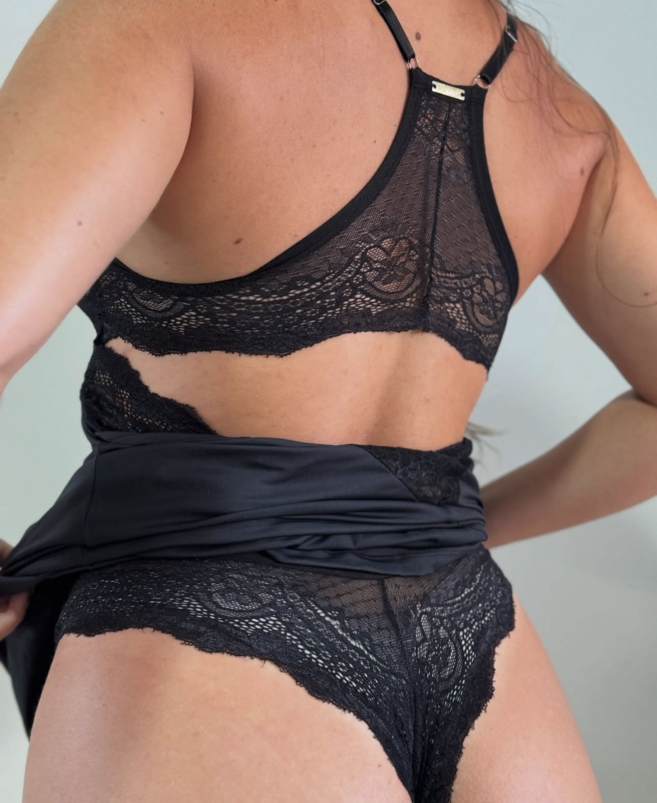 Com tecido transparente e leve, essa camisola envolve o corpo com suavidade, enquanto a renda valoriza as curvas com um toque de mistério e sedução.