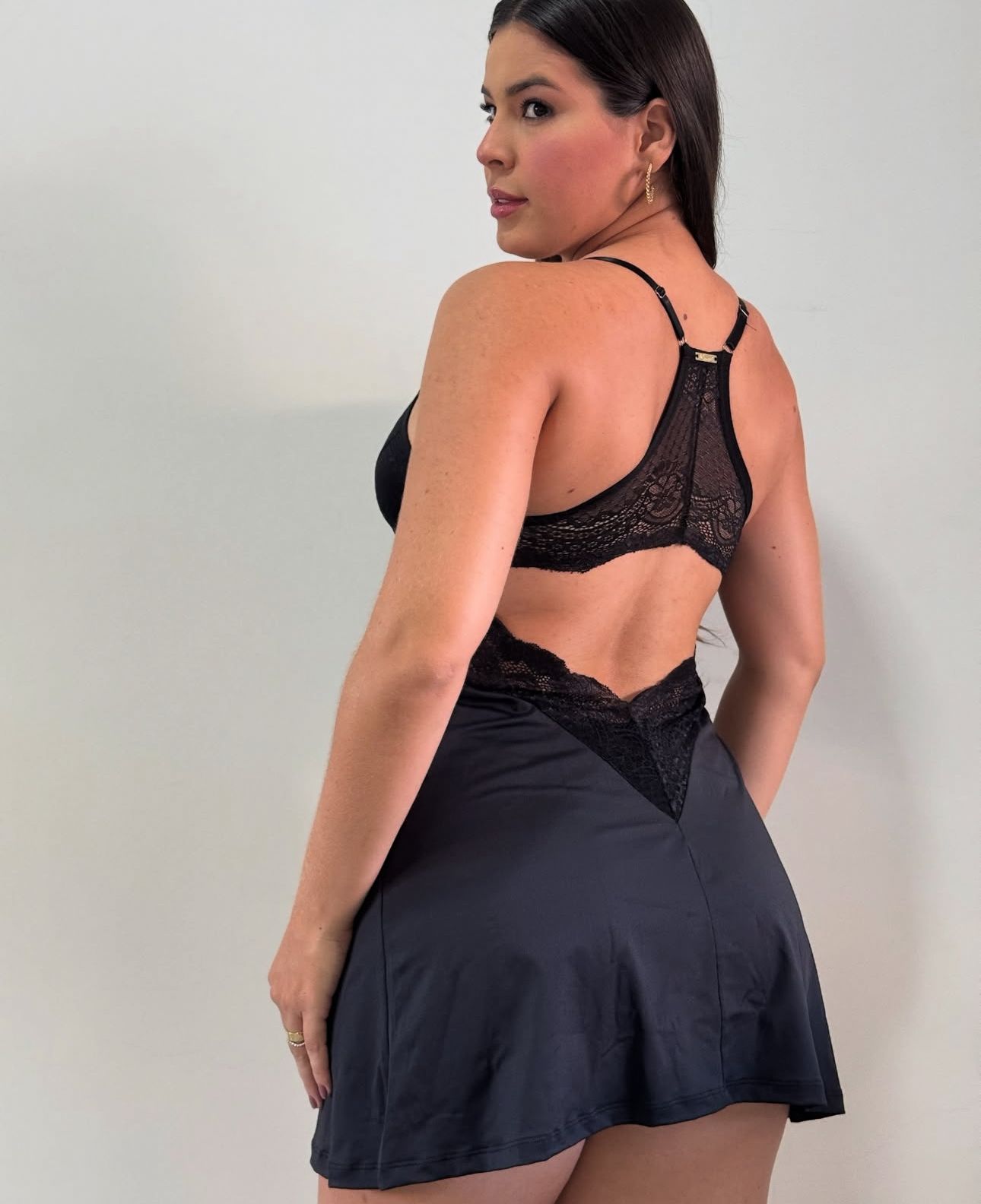 A renda delicada nas costas e cintura cria um contraste marcante com o tecido acetinado e leve, garantindo um visual impactante tanto de frente quanto de costas. E o melhor: acompanha calcinha para um look completo e irresistível.